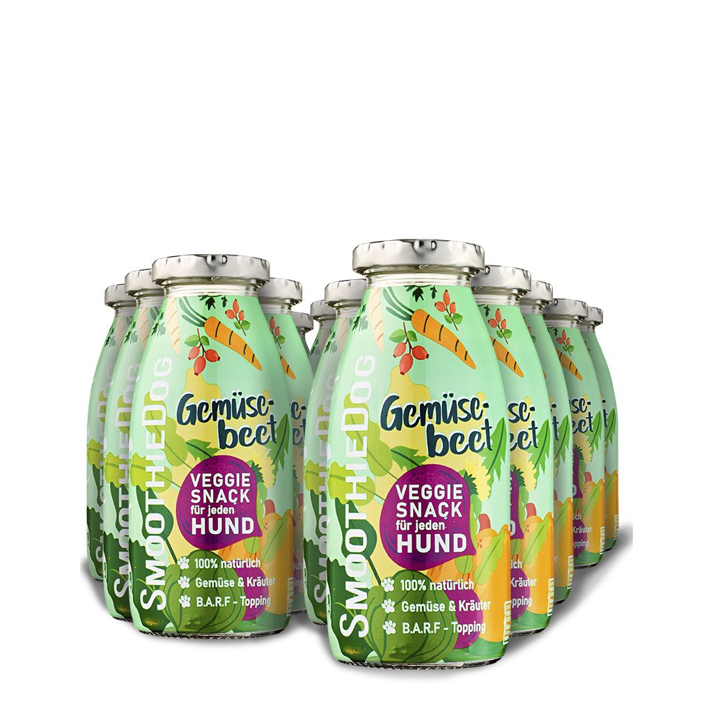 Vegetariánské psí smoothie poskládané z dobrot přímo ze zeleninového záhonu obsahuje spoustu mrkve, dýně, červené řepy, kořenové petržele, lněného semínka, šípku, kurkumy, tymiánu a sušené pampelišky. Toto smoothie najde mnoho nadšených fanoušků a dává psím rodičům dobrou alternativu psí svačiny bez masa.