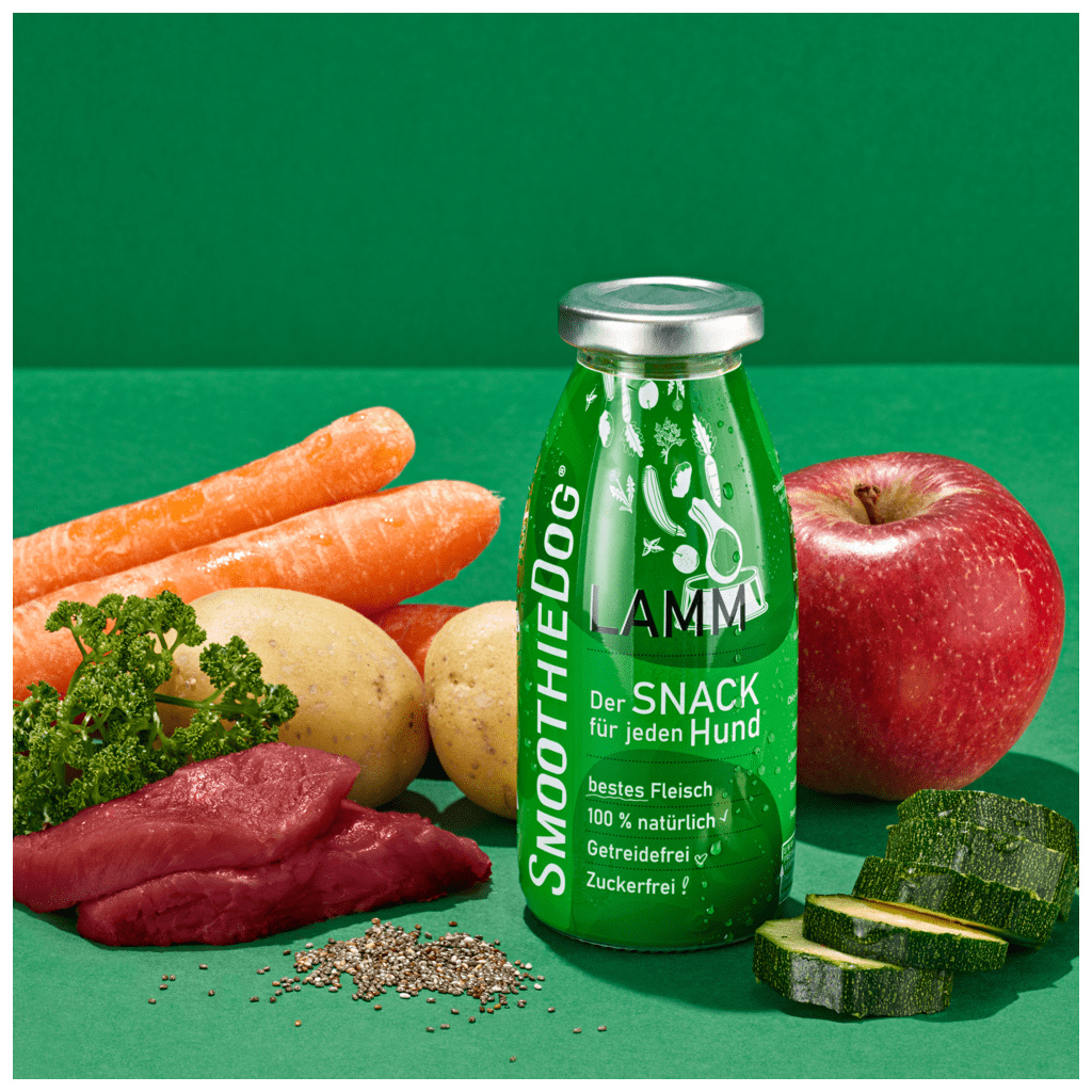 Jehněčí smoothie: Jehněčí maso dokáže pokrýt potřebu B12, navíc nedráždí psí trávení. Mrkev, cuketa a jablka jsou bohaté na vlákninu a superpotraviny v podobě chia semínek a spiruliny dobíjejí pejsky železem, nenasycenými mastnými kyselinami a napomáhají detoxikaci organismus.