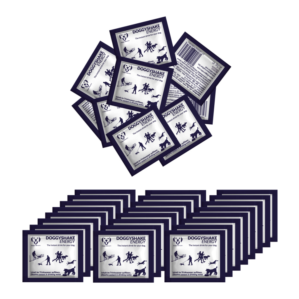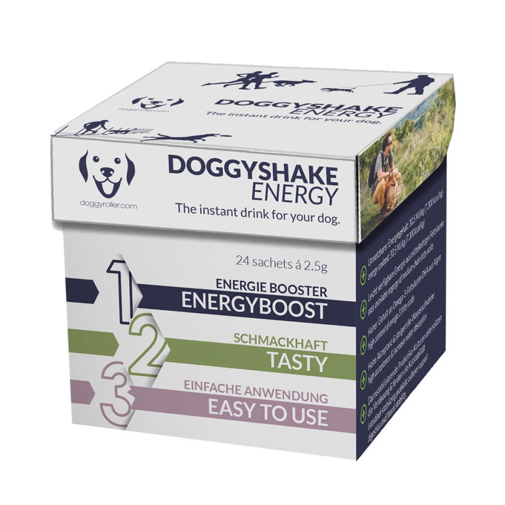DOGGYSHAKE ENERGY se používá k pokrytí až 25 % energetických potřeb vašeho psa dodatečným krmením mezi obvyklými jídly. Tento instantní nápoj je perfektní i do misky s vodou a to i proto, že přiměje pít psy, kteří jsou jinak líní pít. Tato energetická bomba má metabolizovatelný energetický obsah 3,05 MJ/100g (730 kcal/100g) a pomáhá v krátkodobém časovém horizontu doplnit zásoby energie.
