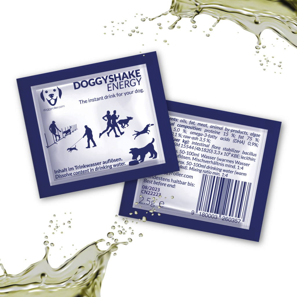 Aplikace: Naplňte DOGGYROLLER vodou (pokud je to možné, tak vlažnou), přidejte 1-2 sáčky DOGGYSHAKE ENERGY (v závislosti na energetické náročnosti), zavřete váleček, protřepejte a je hotovo. Nyní máte přibližně 50 ml dobroty připravené k akci!