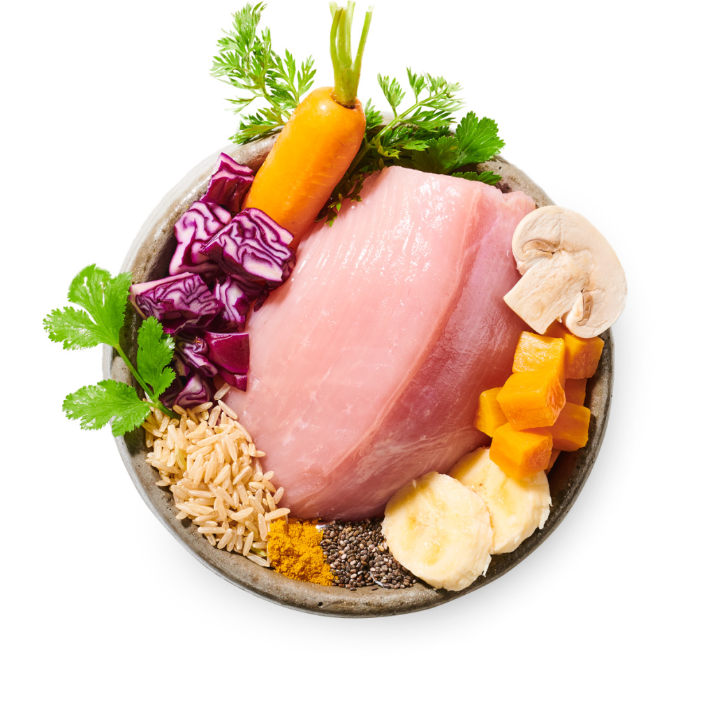 Krůtí maso (50%), krůtí játra (10%), hnědá rýže (5%), červené zelí (10%), sladké brambory (9%), mrkev, banán (5%), žampiony, koriandr, lososový olej, olivový olej, pivovarské kvasnice, chia a kurkuma.