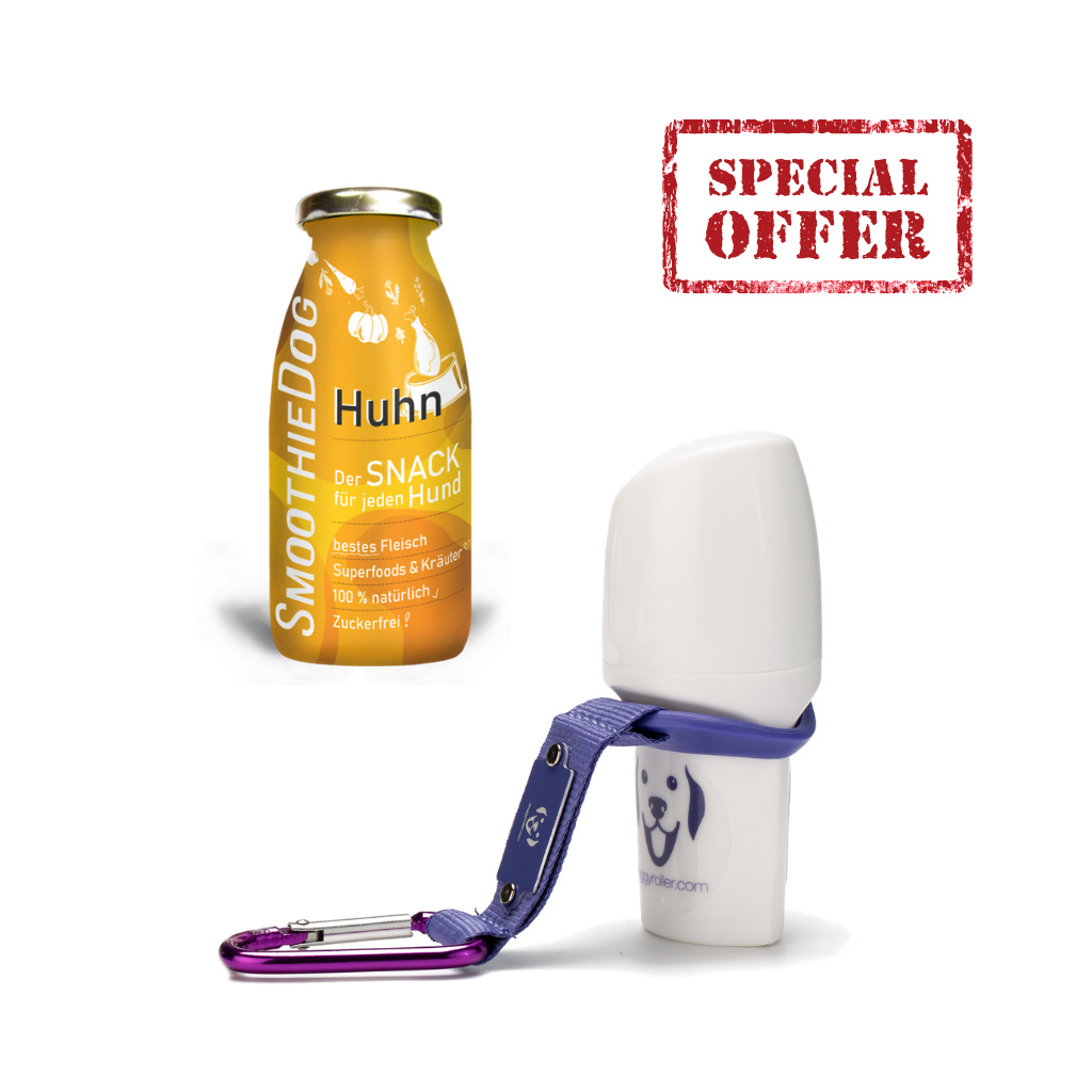 Vyzkoušejte na tréninku toto neodolatelné duo! Kuřecí psí smoothie osvěží vašeho miláčka lahodnou kuřecí svalovinou a dalšími dobrotami v tekutém skupenství ve 100% potravinářské kvalitě a Doggy roller se postará o dokonalé dávkování. Je vhodný i pro pejsky na dietě nebo po nemoci a postará se o chutnou svačinku a doplnění tekutin.