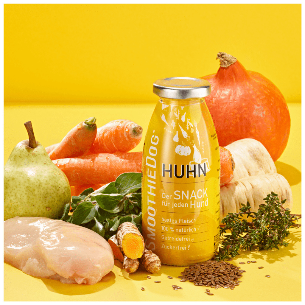 Odrůdy zeleniny pastinák, dýně a mrkev tvoří lví podíl na odrůdě SmoothieDog "CHICKEN". Zejména u kuřecího masa dbáme na dobrý odchov zvířat, který voní a chutná každému psovi. Mrkev má pozitivní vliv na srážlivost krve, může pomoci při průjmu u psů, posiluje imunitní systém a obranyschopnost psa a podporuje krásnou lesklou srst. Čerstvá hruška poskytuje na vitamíny bohatou a lahodnou sladkost. Zlaté lněné semínko podporuje trávení ve střevě psa. Přirozeným barvivem žlutého psího smoothie je superpotravina kurkumaa rozhodně opravdová léčivá rostlina, protože prý působí antibakteriálně a čistí krev. Barevná směs bylinek tymiánu, pampelišky a oregana tuto odrůdu dokonale završuje - pro každého psa od štěněte po seniora.