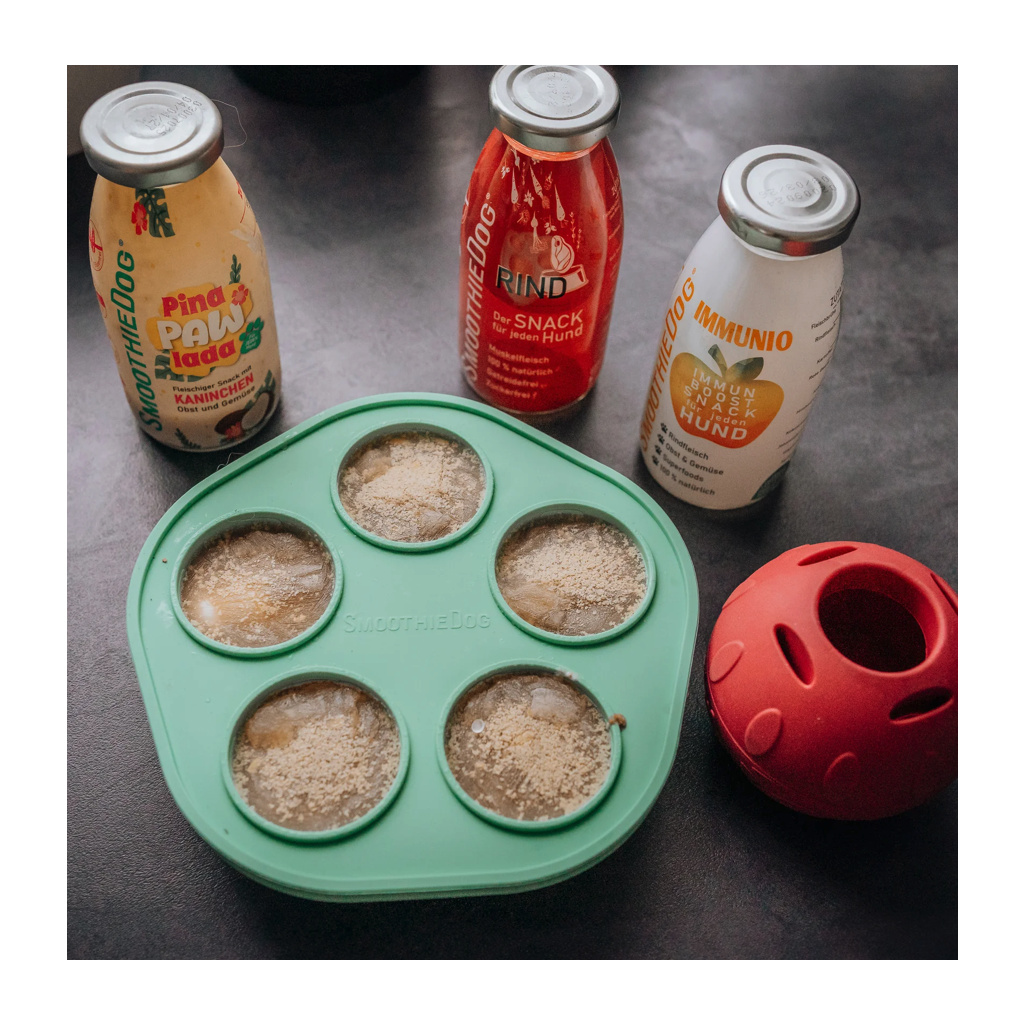 Přiloženou formu lze snadno naplnit SmoothieDogem – v létě je ideální k zamrazení a v zimě k výrobě gumových medvídků pro psy v kuličkách k olizování .