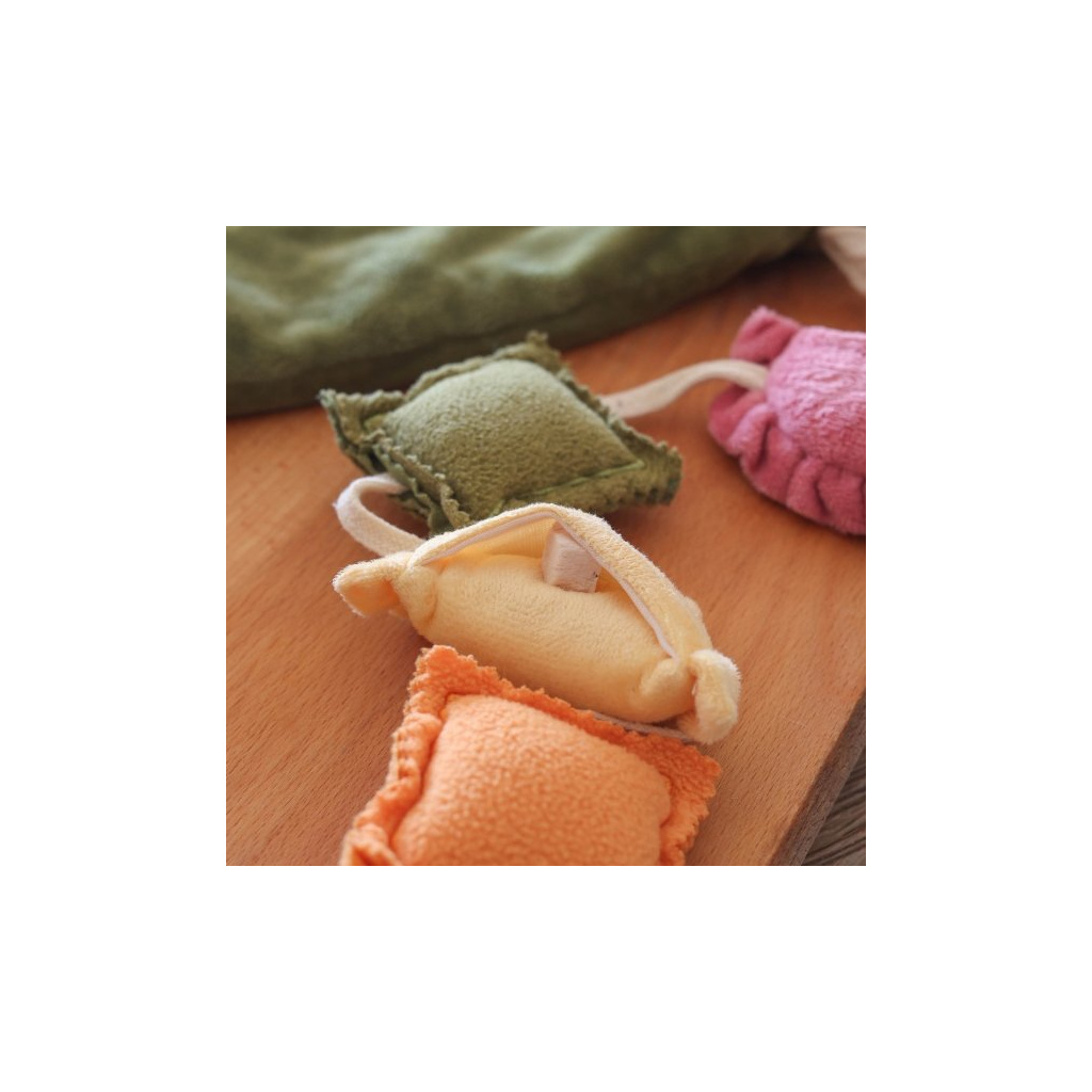 Ravioli mají nejen kapsy na pamlsky, ale také šustící papír a pískací hračky , které stimulují smysly a hraní si ještě více umocňují.